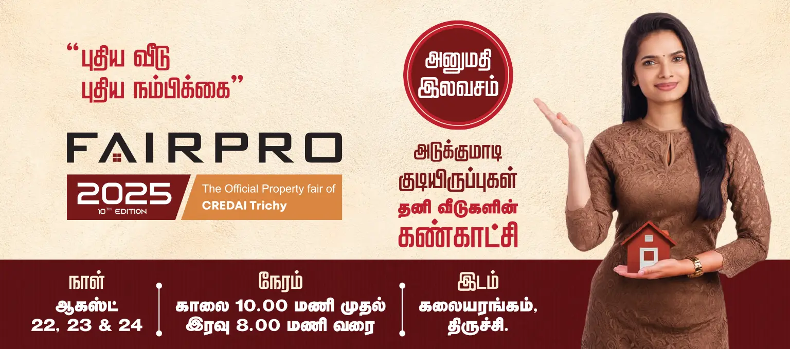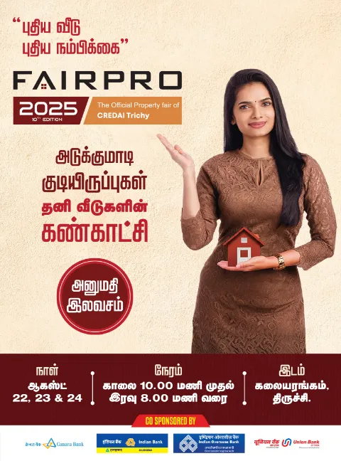Welcome to Fairpro Trichy 2025, the premier real estate event in Tiruchirappalli! Explore an extensive range of residential and commercial projects by renowned developers. Discover the latest real estate trends in Trichy, where affordability meets quality. From luxurious apartments to budget-friendly housing options, there's something for everyone's needs. Engage with industry experts, builders, and financial institutions to find your perfect property.